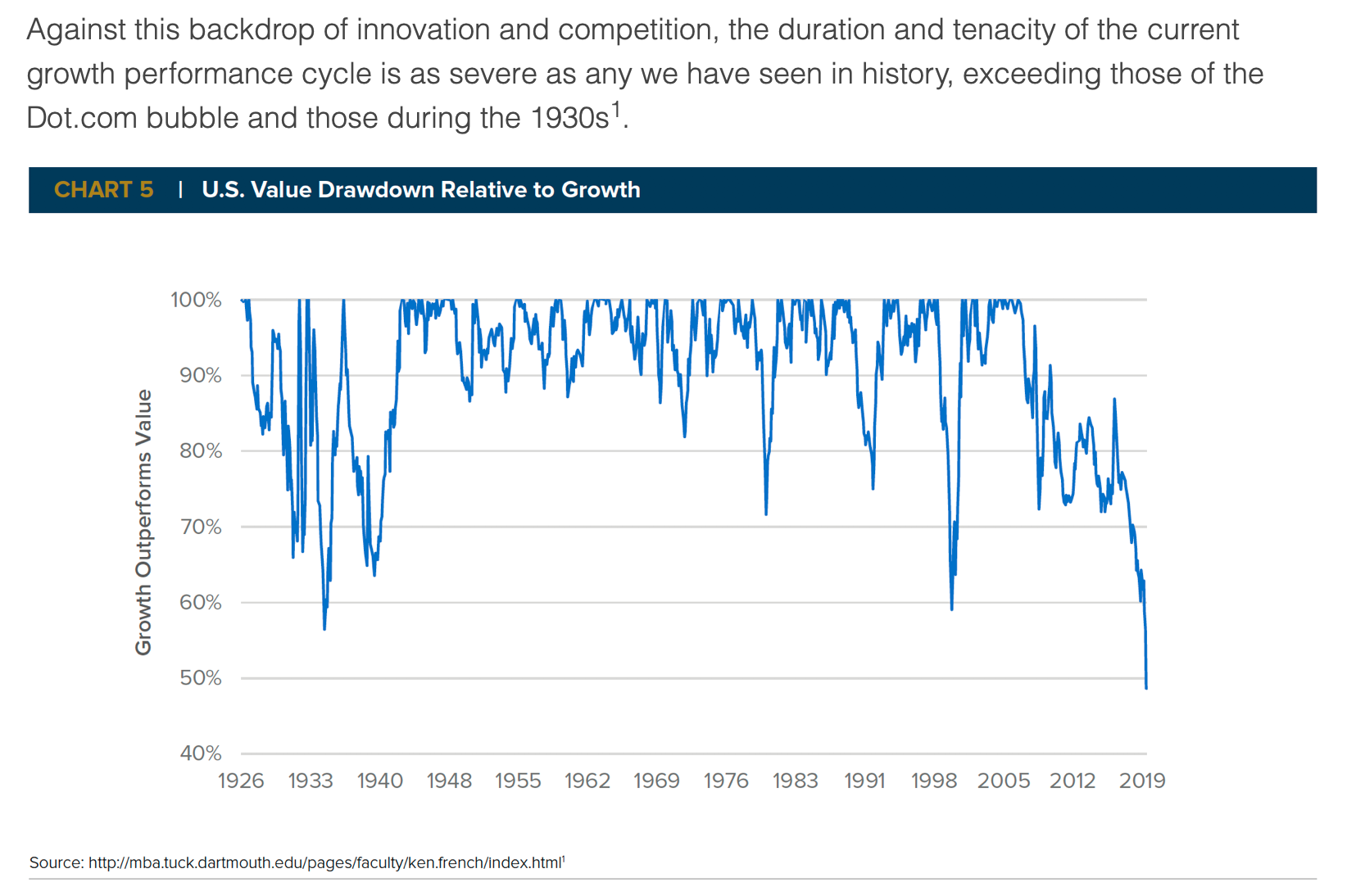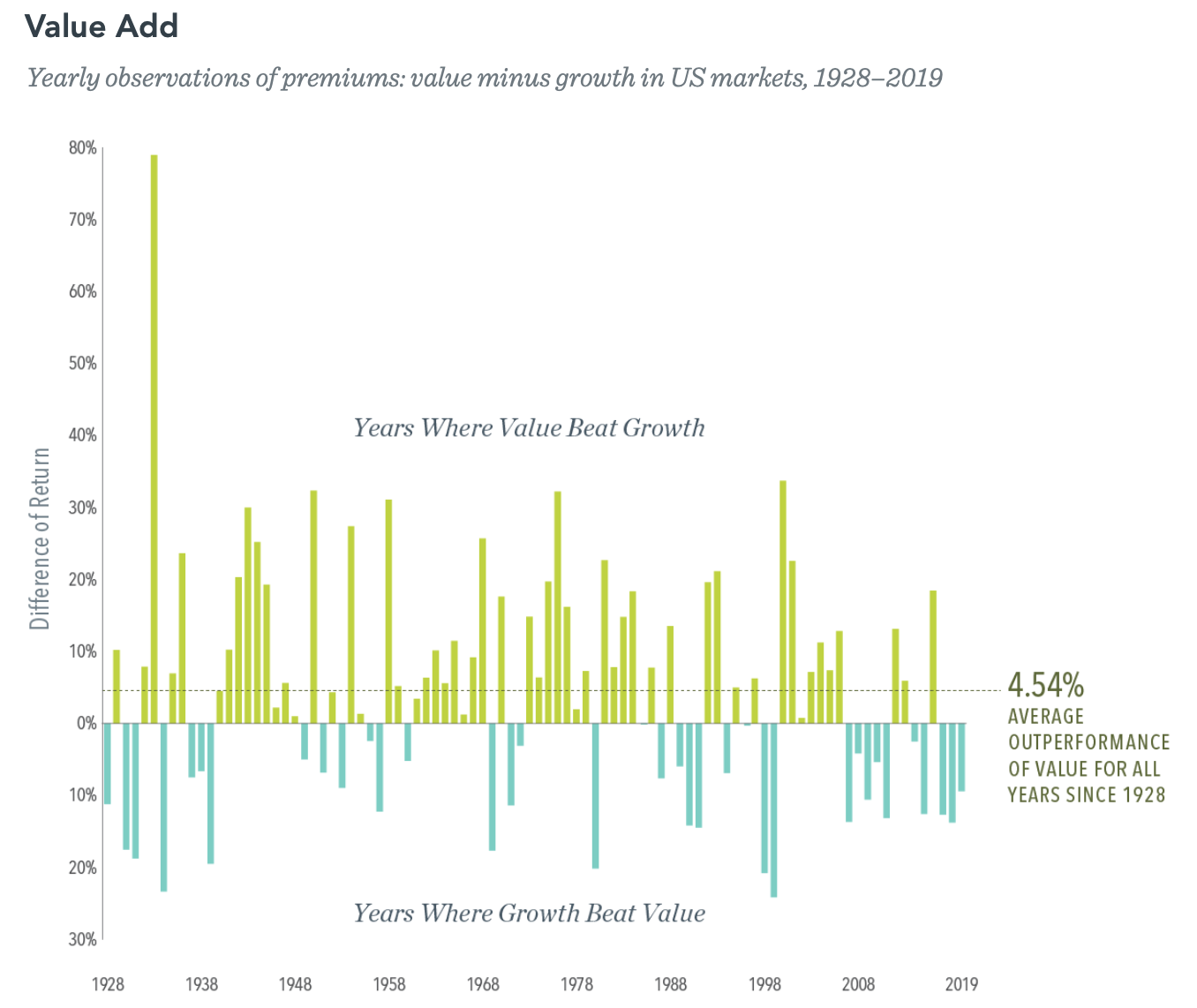 "Value investing has long held a structural advantage over growth investing when considered over multiple market cycles. In fact, if one were to have invested $1 each in value and growth stocks in December 1927, the value investment would today be worth nearly 18 times the growth investment."