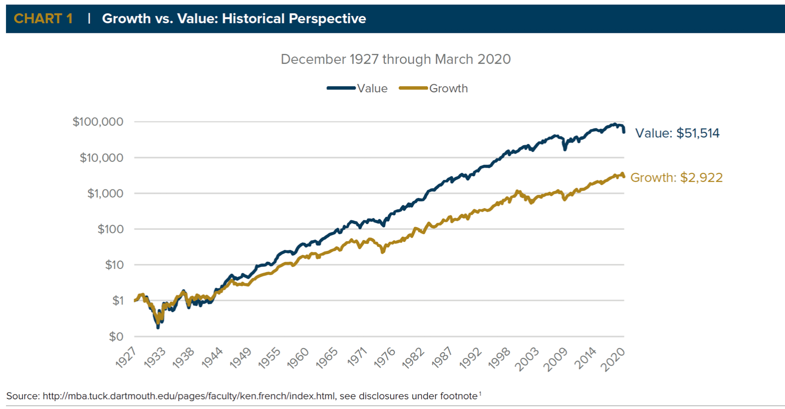 "Value investing has long held a structural advantage over growth investing when considered over multiple market cycles. In fact, if one were to have invested $1 each in value and growth stocks in December 1927, the value investment would today be worth nearly 18 times the growth investment."